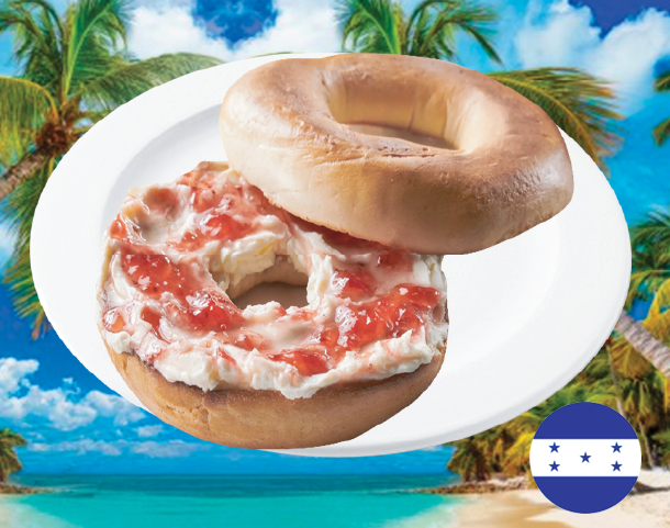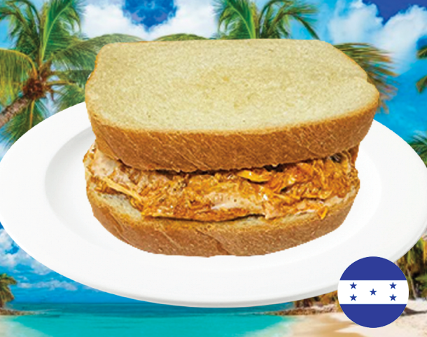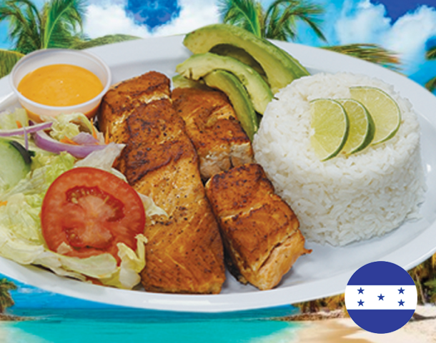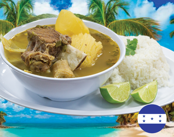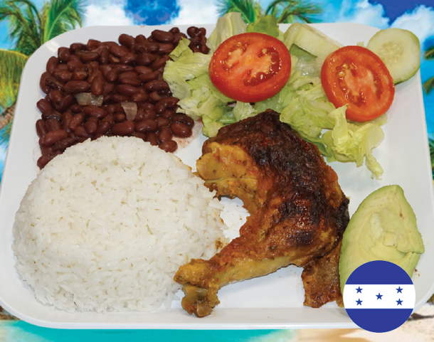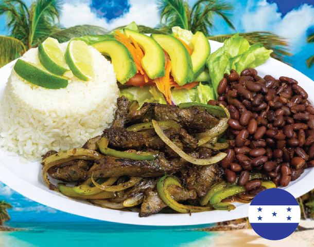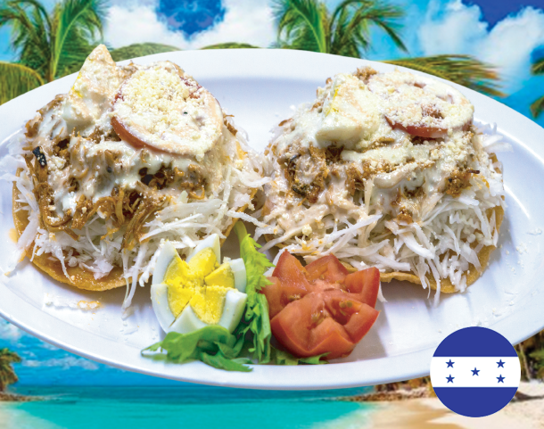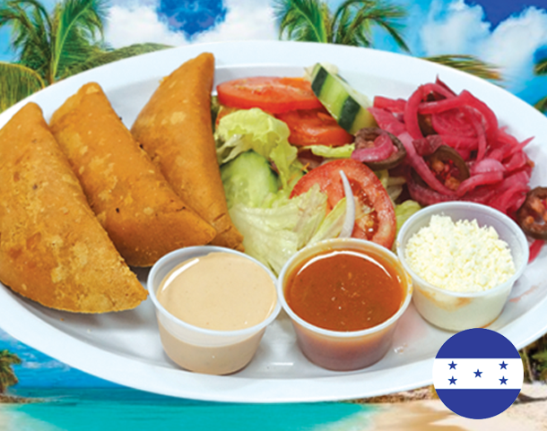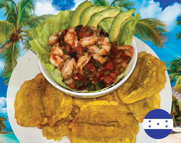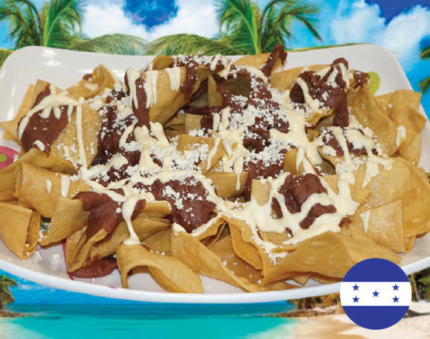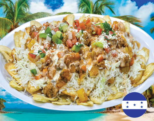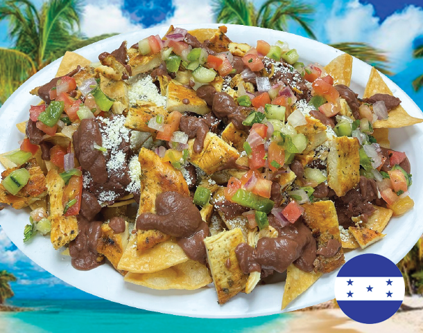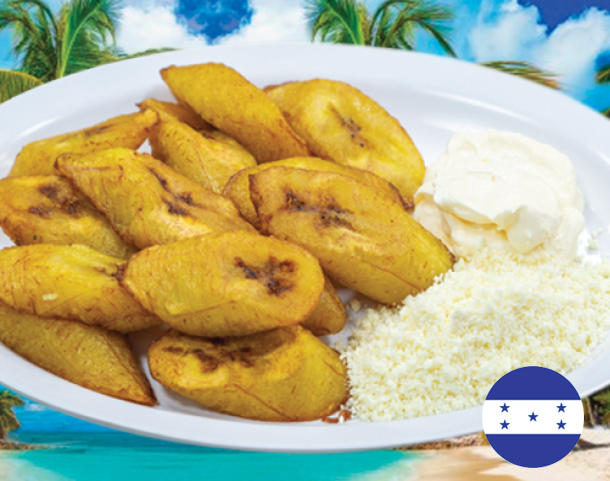 Platano maduro, salchicha, aguacate, frijol frito, queso y crema